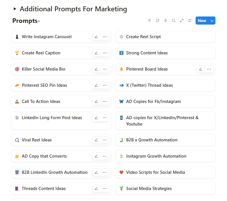 Social Media Marketing Prompts: Instagram captions, Facebook ad copy, LinkedIn post ideas, TikTok scripts, Pinterest board ideas, and more.