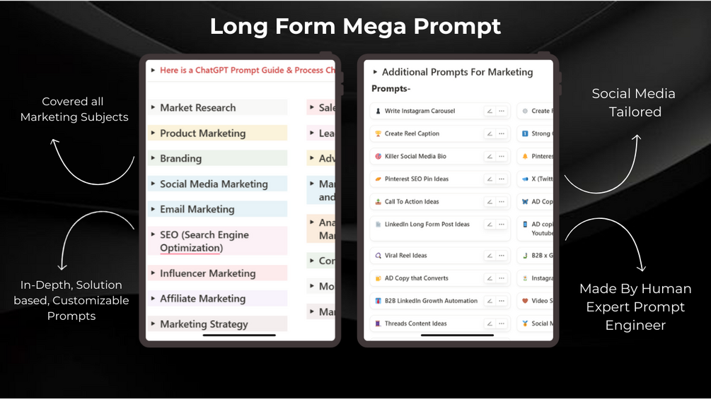 Comprehensive Marketing Prompts: From Market Research to Marketing Automation, this digital toolkit covers every aspect of marketing. These AI-driven prompts are designed to help you craft engaging content, optimize your digital presence, and accelerate your sales pipeline.