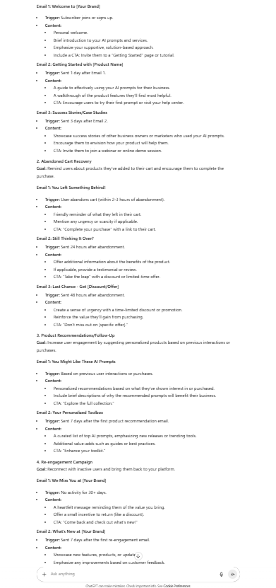 Marketing Automation Prompts: Automate repetitive tasks and improve productivity by generating ideas for marketing funnels, email sequences, and drip campaigns.